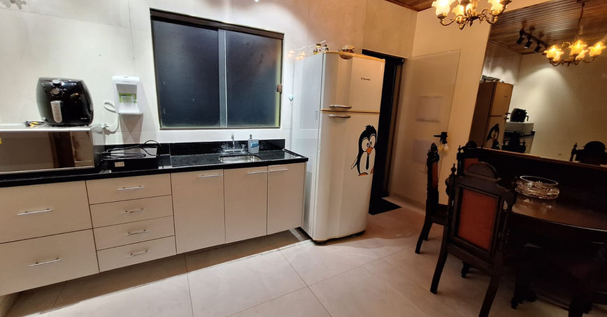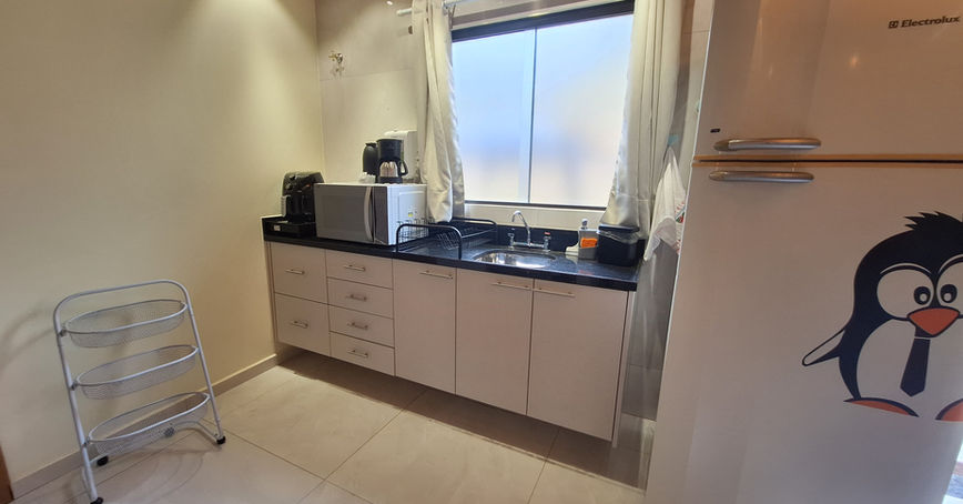 Cozinha completa - Fogão de indução, frigobar, micro-ondas, fritadeira elétrica e cafeteira.